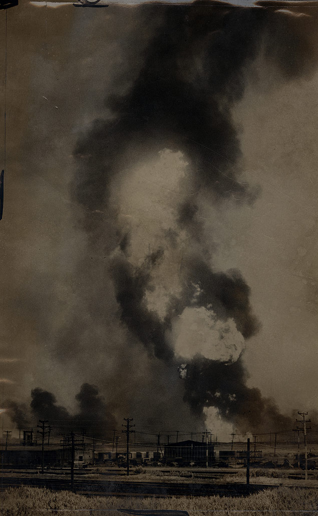 Flames and smoke tower into the sky marking the explosion of gasoline storage tanks in the port of Newark, New Jersey. |